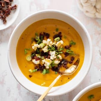 My honeynut squash soup is sweet and spicy, starting off with chipotle caramelized bacon and ending with buttered popcorn! It’s savory, rich, and satisfying...
