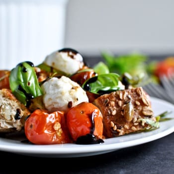 Roasted Tomato Caprese Panzanella serves about 4 4 cups grape tomatoes 4 cups cubed multigrain bread 6 tablespoons...