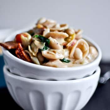 Creamy Tuscan White Bean Pasta serves 4 2 cups whole wheat pasta 1/4 cup chopped pancetta 1/2 onion, chopped 3 garlic cloves, minced 4...