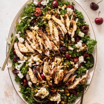 This grilled cherry chicken kale salad is so satisfying and delicious! Grilled balsamic chicken, fresh cherries, red onion, goat cheese, pistachios and an amazing...