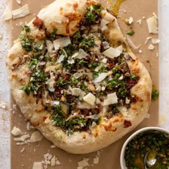 This summer mushroom pizza is absolutely incredible! Chewy crust, asiago cheese, sautéed mushrooms with bacon and a big drizzle of a pistachio herb dressing....