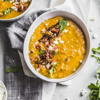 Welcome to the ugliest recipe I’ve ever posted. Oh… hey there. Loaded baked sweet potato soup coming right at you! You know that potato...