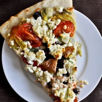 Greek Pizza makes one pizza 1 batch of your favorite pizza dough 1/2 batch of creamy feta 1 head of garlic, cloves removed and...
