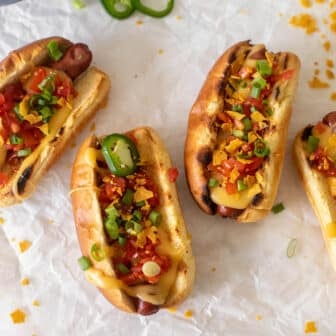 These queso hot dogs are such a fun twist on the classic hot dog! Grilled hot dogs with melty cheese, jalapeno peppers, tomatoes, scallions...