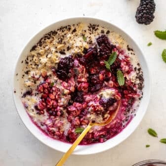 We love these blackberry chip overnight oats! Easy to make ahead for breakfast, chewy, satisfying overnight oats and made with a quick blackberry sauce...