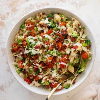 This broccoli BLT pasta salad is the perfect summer side dish! Made with my asiago ranch, it tastes like a fabulous BLT with broccoli....