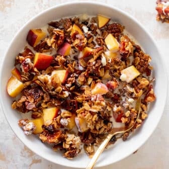 I adore this peach cobbler granola! Peach cobbler granola is made with dried peaches, peach preserves, oats, pecans, brown sugar and white chocolate chips....