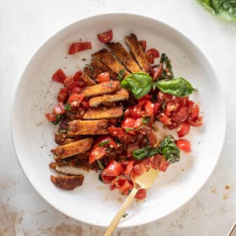 We love this crispy bruschetta chicken! Paper-thin, crunchy chicken cutlets are topped with juicy summer tomatoes, lots of garlic, fresh basil and fruity olive...