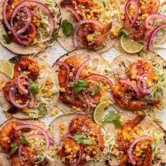 These roasted shrimp tacos are a weeknight favorite! Easy smoky shrimp roasted with corn, served with a crisp and refreshing lime slaw. Delicious! I...