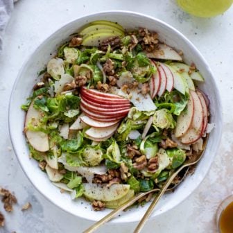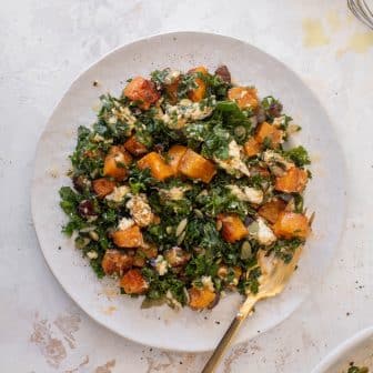 I adore this butternut squash chopped salad! Kale, roasted, caramely buttery squash is served with creamy goat cheese, crunchy pepitas, dates and a delicious...