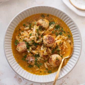 This chicken meatball noodle soup is such a fun twist on the classic! Mini chicken meatballs served in parmesan brother with orzo pasta and...