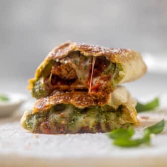 We love these melty meatball wraps! Our favorite ricotta meatballs are tossed in marinara then stuffed in a wrap with pesto and cheese. Toasted...