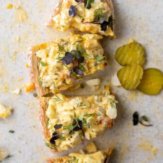 This dill pickle egg salad is my all-time favorite lunch! Big chunks of hard boiled eggs tossed with diced pickles, sweet relish, dill, chives,...