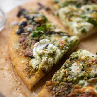 This pistachio pesto pizza tastes like spring! Buttery, nutty pistachio pesto, creamy ricotta cheese, asparagus spears, green peas and lemon give this pizza so...