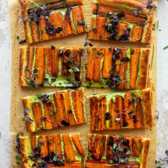 Spring is calling! This carrot puff pastry tart is beautiful and delicious. Made with green goddess ricotta cheese, butter caramelized carrots and flaky puff...