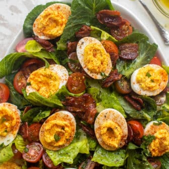 This deviled egg salad is a fun way to serve deviled eggs! Crisp romaine, fresh tomatoes and crunchy bacon come together with an herby...