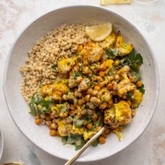 These golden cauliflower chickpea bowls are perfect for lunch or dinner. Cauliflower florets and chickpeas are roasted with turmeric, ginger and garlic for a...