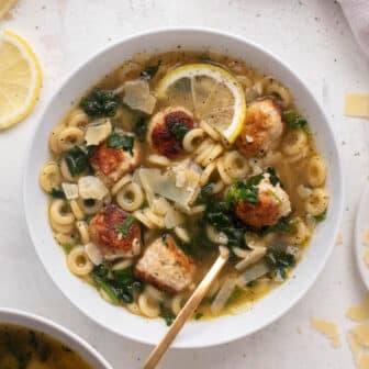 We love this lemon chicken meatball soup! Tender lemon chicken meatballs are cooked in a parmesan broth with pasta and veggies. This recipe is...