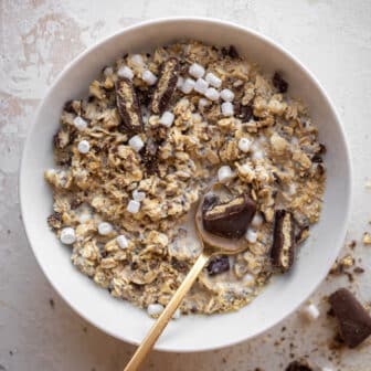 S’mores overnight oats taste like a marshmallow chocolate explosion in a bowl. Chewy overnight oats are studded with mini marshmallows and mixed with graham...