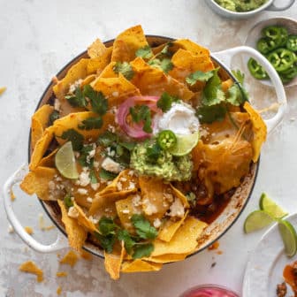 We love these one pot nachos! The bottom layer is a taco-seasoned ground beef, green chile and pinto bean mixture, topped with tons of...