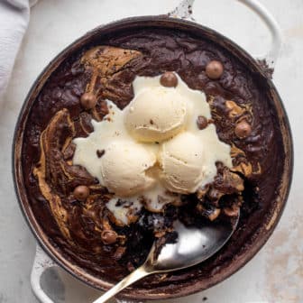 Chocolate peanut butter lovers will love this brownie skillet! Chewy, gooey brownie swirled with peanut butter, then baked and served with vanilla ice cream....