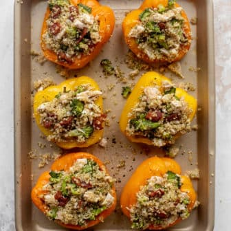 We love these chicken bacon ranch stuffed peppers! Caramelized peppers stuffed with a quinoa filling, loaded with chicken, broccoli, bacon, ranch seasoning and more....