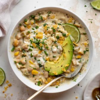 This super hearty white chickpea chili is a comforting hug in a bowl. All the flavor of white chicken chili, minus the meat. A...
