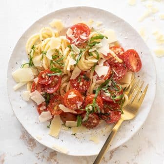 We love this pasta with no cook tomato sauce! Juicy marinated tomatoes with lots of basil and garlic are tossed with hot pasta. Add...