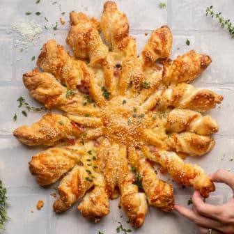 This ham and swiss puff pastry is twisted into a beautiful holiday star and such a delicious crowd-pleasing appetizer! Melty cheese and crispy ham...