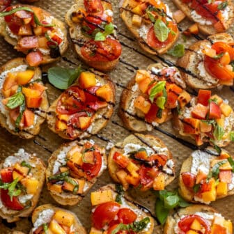 We adore this peach bruschetta in the summer! Combined with juicy tomatoes, garlic and basil, this is a dream when spooned over garlicky crostini...