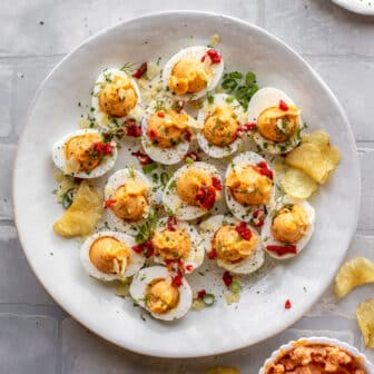 These pimento cheese deviled eggs are made with a rich pimento cheese filling, topped with sliced scallions, pimentos and crushed potato chips for extra...