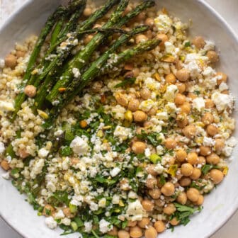 These spring couscous bowls are loaded with chickpeas, roasted asparagus, fresh herbs, roasted pistachios and drizzled all over with a lemon feta vinaigrette. So...