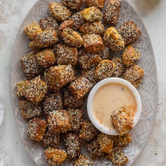 These everything soft pretzel bites are soft and chewy and amazing! Serve with chipotle cheddar beer cheese dip – it’s heaven! Our weekend treat...