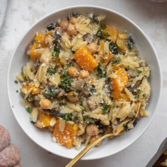 This one pot vegetable orzo and chickpeas is a cozy fall meal. All of your favorite autumn vegetables come together with chickpeas and orzo...