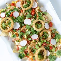 Summer BBQ Chicken Nachos with Buttermilk Onion Rings.