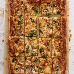 Garlicky Grilled Chicken and Broccoli Puff Pastry Pizza.