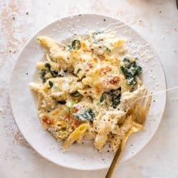 Baked Butternut Squash, Sausage and Spinach Pasta.