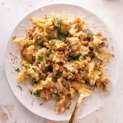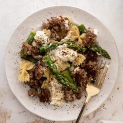 Crispy Sausage and Asparagus Farfalle with Burrata.