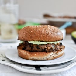 Easy Double Bean Burgers with Avocado Basil Cream.