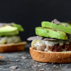 Goat Cheese Guac Burgers with Cheddar and Caramelized Onions.