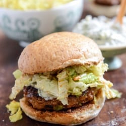 Turkey Burgers with Creamy Gorgonzola and Chili Garlic Slaw.