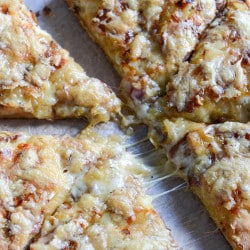 Caramelized Onion, Gruyere + Pepper Bacon Whole Wheat Pizza.