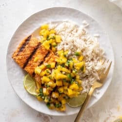 Grilled Salmon with Mango Salsa & Coconut Rice.