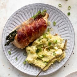 Prosciutto Wrapped Asparagus Stuffed Chicken with Scallion Smashed Potatoes.