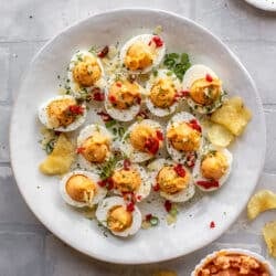 Pimento Cheese Deviled Eggs with Crushed Potato Chips.