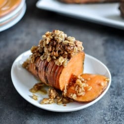 Cinnamon Sugar Hasselback Sweet Potatoes with Oatmeal Cookie Crumble.
