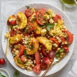 Sweet Corn, Peach and Tomato Salad with Crispy Quinoa.