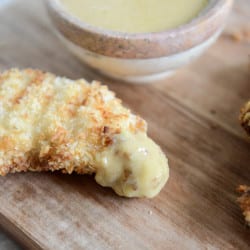 Crunchy Coconut Chicken Fingers with Peach Honey Mustard.