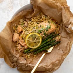 Salmon Aglio e Olio with Lemon Parmesan Orzo.