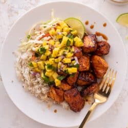 Grilled Salmon with Mango Salsa & Coconut Rice.